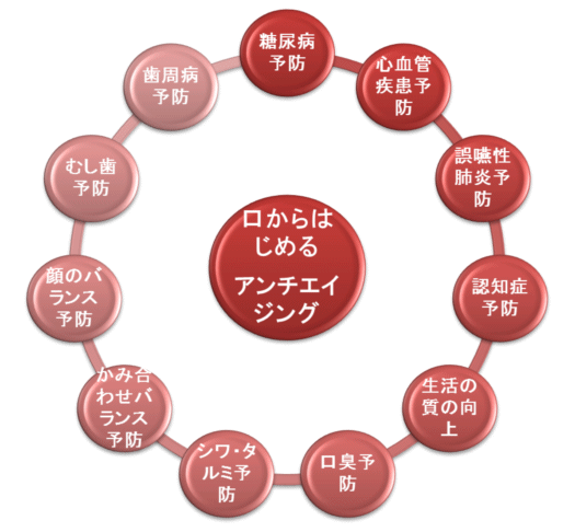 また、近年、口腔環境の改善により、糖尿病予防、心血管疾患予防、誤嚥性肺炎予防、そして認知症予防にもつながることが明らかになってきました。