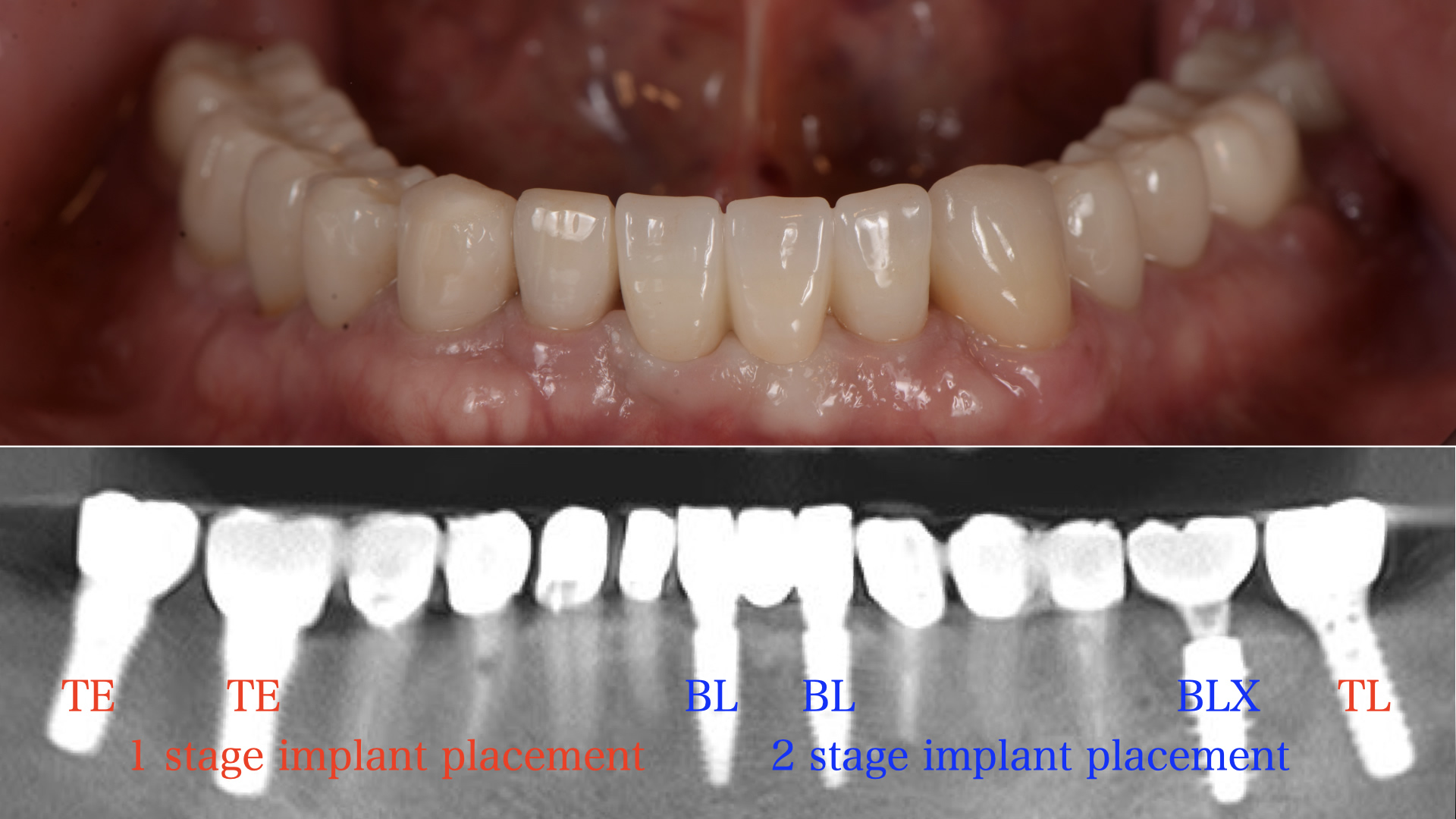 (図説)矯正治療によって歯列と噛み合わせを整え、欠損部をインプラントにて回復した一例。患者さんから見て右上2番目3番目のインプラント部には、骨増大術(GBR;Guided bone regeneration)と結合組織移植術(CTG;Connective Tissue Graft)を併用。左上1番目は、抜歯と同時にインプラントを埋め込み(抜歯後即時埋入)、同時に歯層堤保存術(Ridge preservation)を行っている。